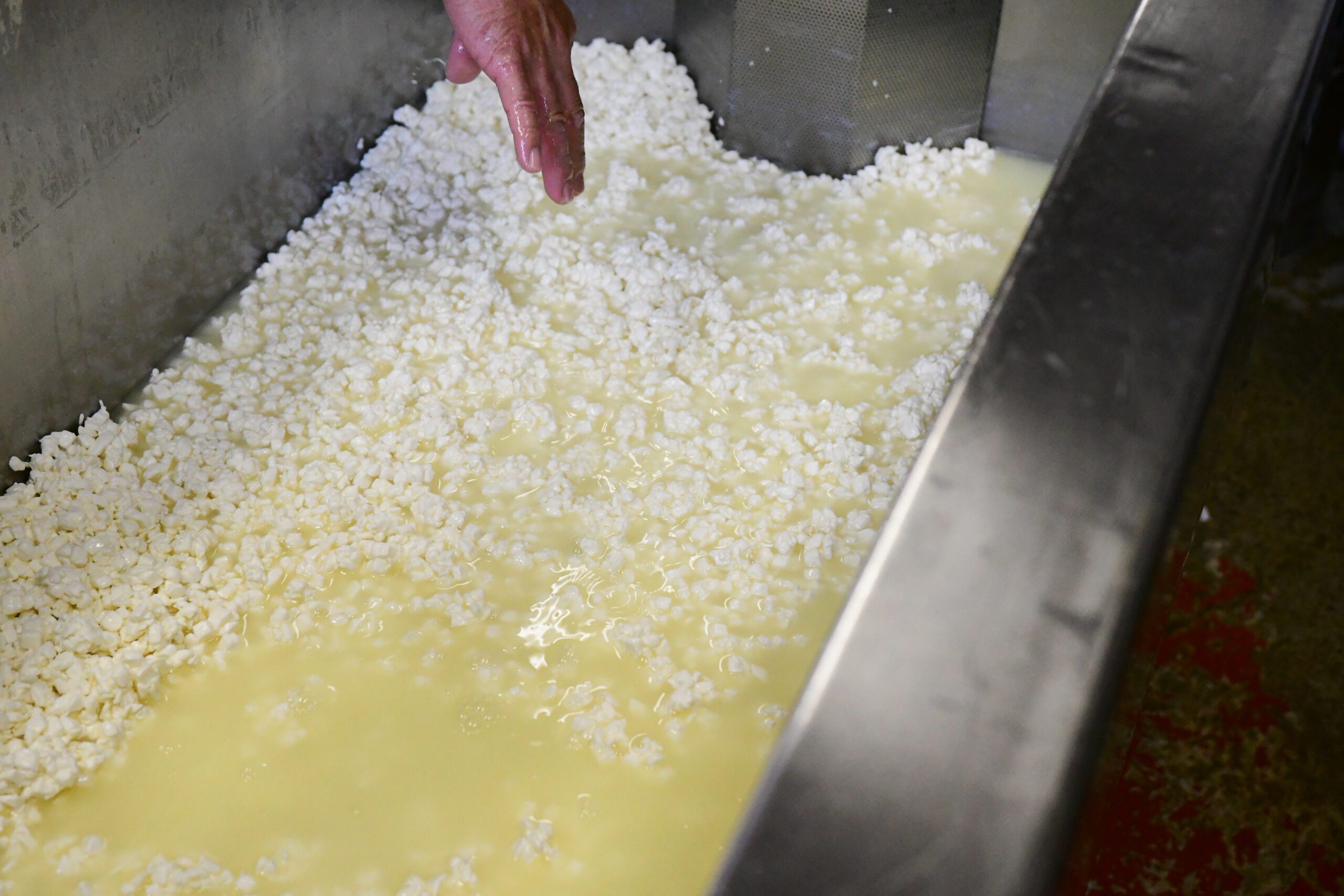 タイミングですね。カード(チーズのもと)が硬くなりすぎたら、もうダメ。元には戻らないのですべて廃棄になります。ここだ!という数分のチャンスを逃さないように、ずっと付きっきりです。